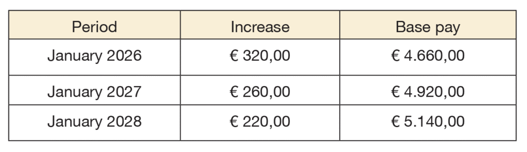 From a pay perspective, the main development is the increase in base pay, which will be implemented in three instalments to be paid with the June payroll in each of the next three years. For the reference level C3, the total gross monthly increase is €177.62. The table below summarises the new minimum wage for the different contractual levels: